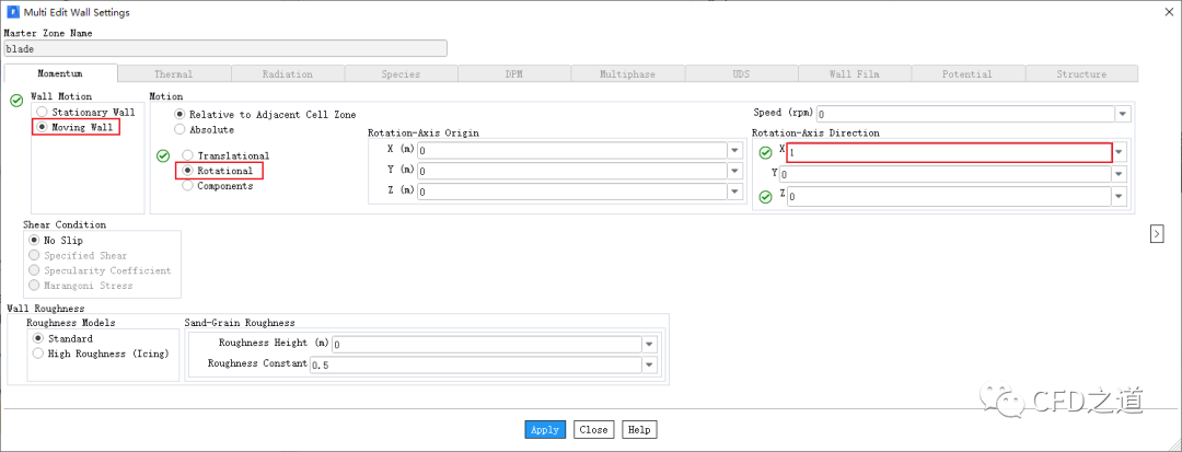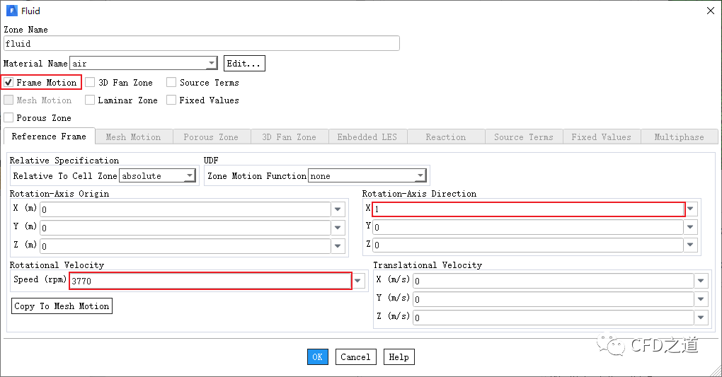 设置区域沿x轴旋转速度为3770 rpm,如下图所示