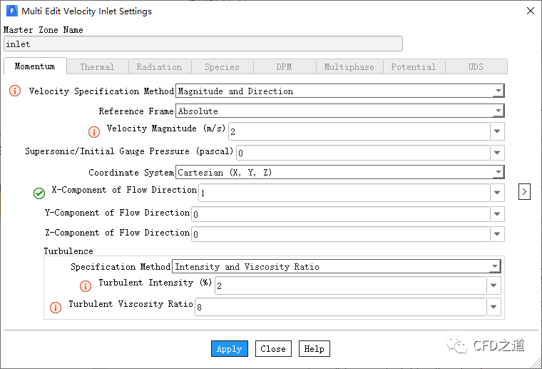如下图所示设置入口速度为2 m/s,设置方向为x方向