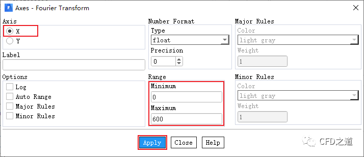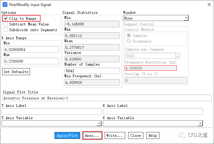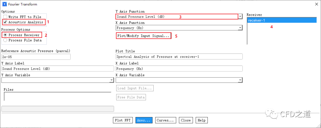计算完毕后双击模型树节点Plot > FFT打开傅里叶变换对话框,如下图所示设置参数,点击按钮Plot/Modify Input Signal…打开设置对话框