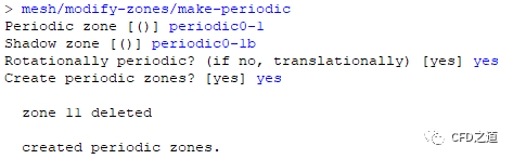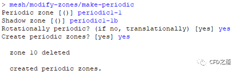 如下图所示利用命令 mesh/modify-zones/make-periodic创建周期边界