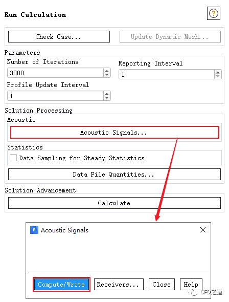 打开Run Calculation面板,如下图所示点击按钮Acoustic Signals…打开计算对话框,点击按钮Compute/Write开始声学计算