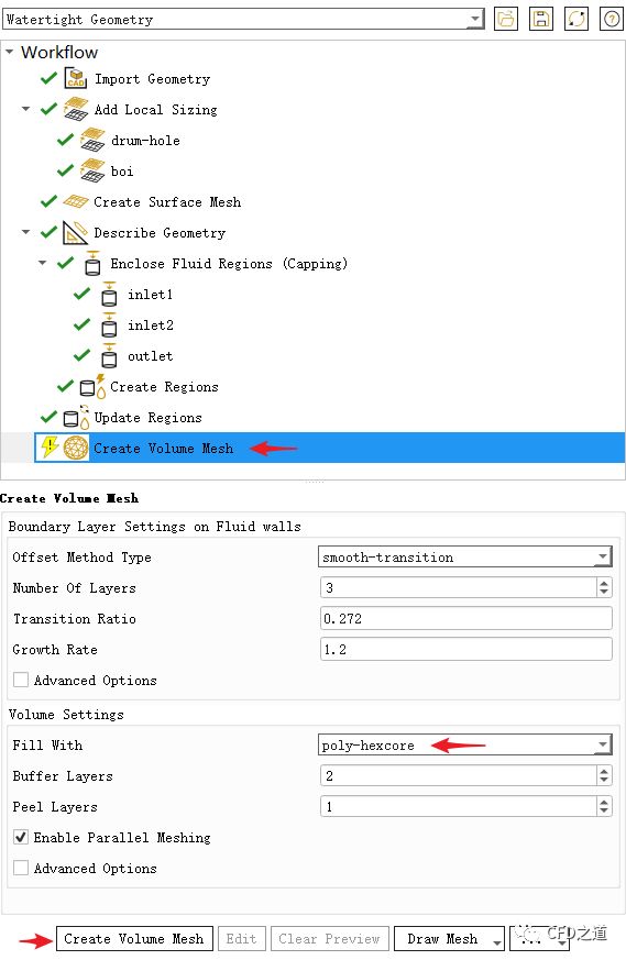 点击节点Create Volume Mesh,设置选项Fill With为poly-hexcore