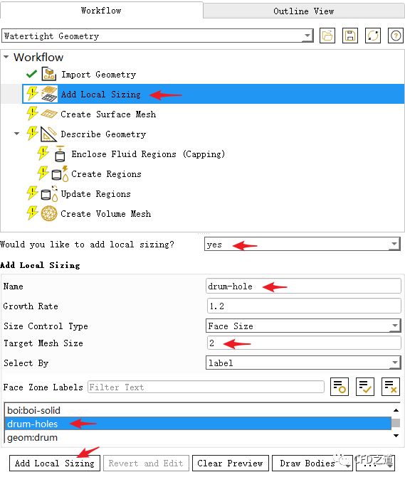 设置Name为drum-hole,指定Size Control Type为Face Size,设置Target Mesh Size为2