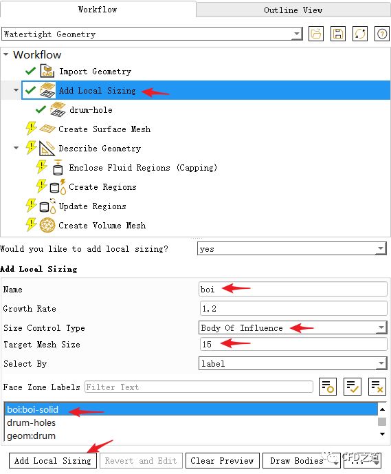 相同的方式创建Body Of Influence,如下图所示指定其尺寸为15,选择列表项boi:boi-solid,点击按钮Add Local Sizing添加局部尺寸