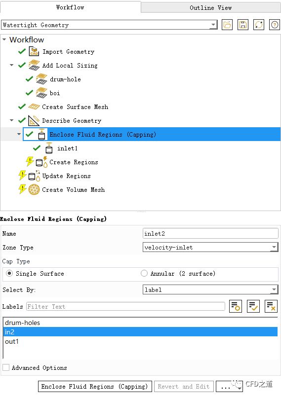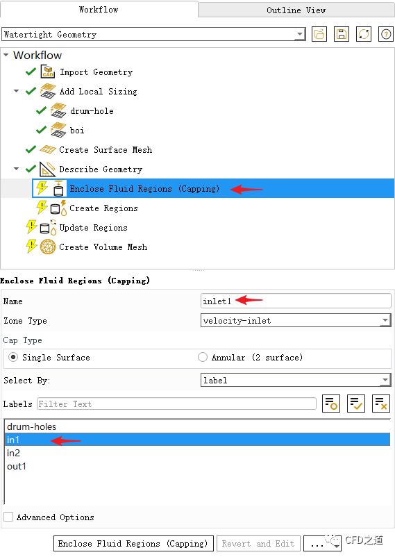 点击模型树节点Enclose Fluid Regions(Capping),如下图所示创建进口inlet1