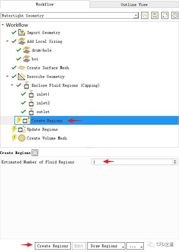 点击模型树节点Create Regions,设置Estimated Number of Fluid Regions为1