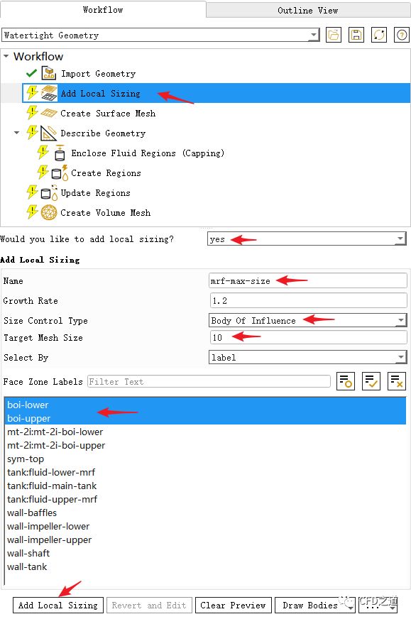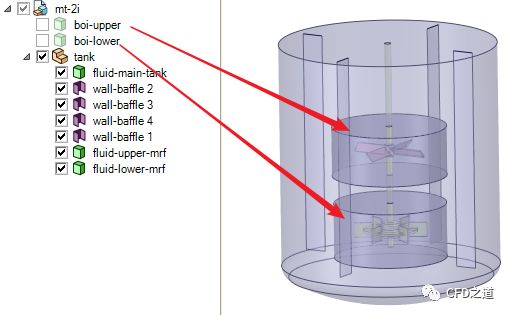 注:BOI几何主要用于网格局部加密。本案例中的两个boi几何是拷贝了两个MRF区域(模型树中的fluid-uppper-mrf及fluid-lower-mrf)。