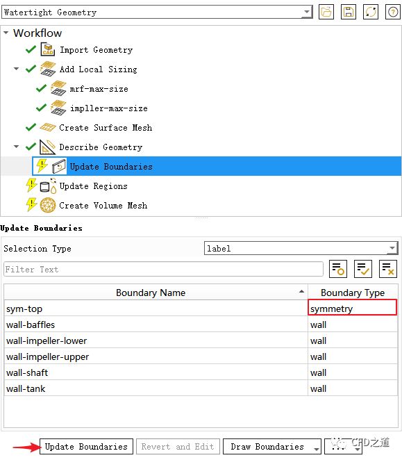 点击节点Update Boundaries,如下图所示,设置边界sym-top为symmetry
