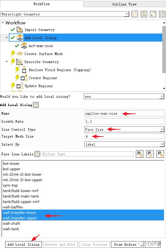 选择模型树节点Add Local Sizing,如下图所示设置参数
