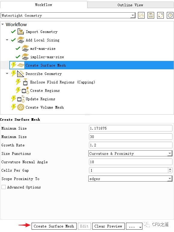 点击节点Create Surface Mesh,采用如图所示参数,点击按钮Create Surface Mesh创建面网格
