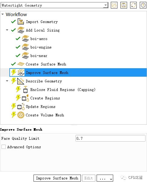 选择节点Improve Surface Mesh,下方属性面板中设置参数Face Quality Limit为0.7,点击按钮Improve Surface Mesh优化网格
