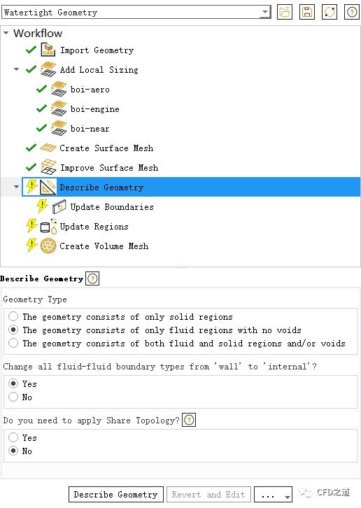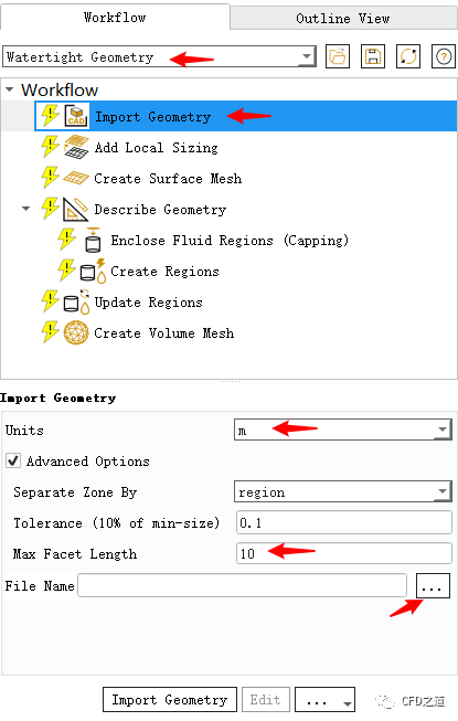 进入Watertight workflow,点击节点Import Geometry,点击下方文件浏览按钮打开几何文件half-aircraft.scdoc