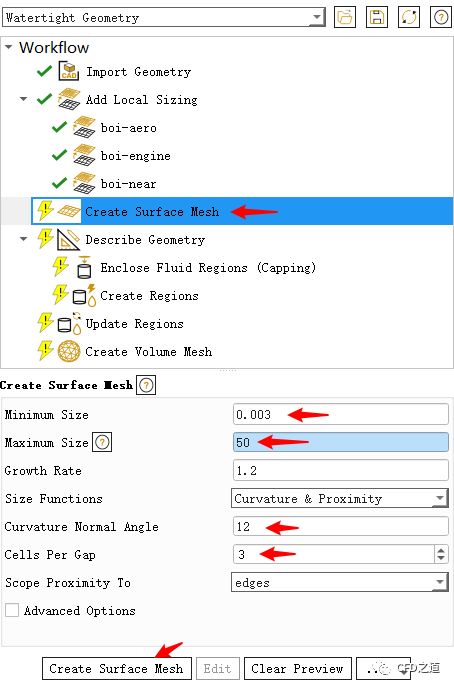 点击节点Creat Surface Mesh,如下图所示设置参数并生成面网格