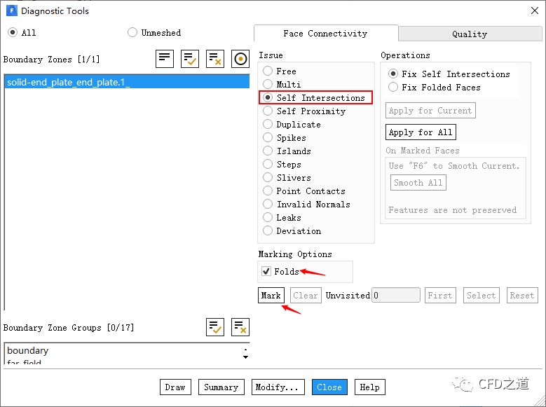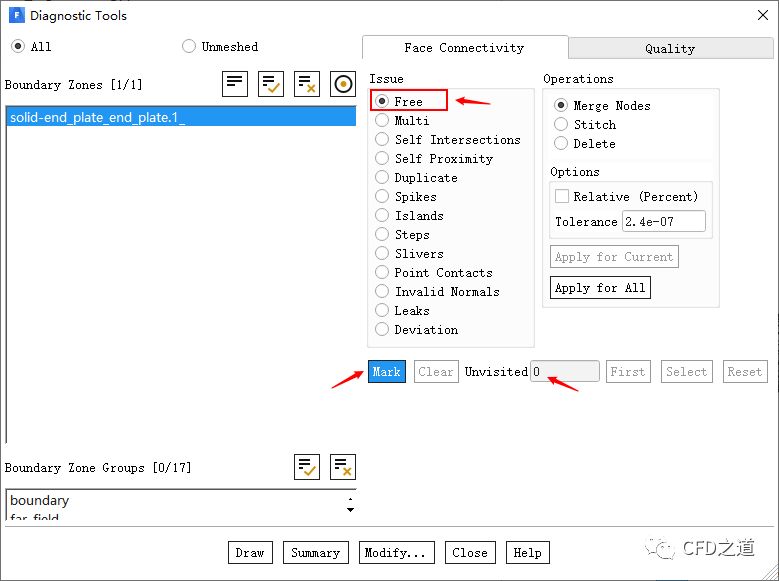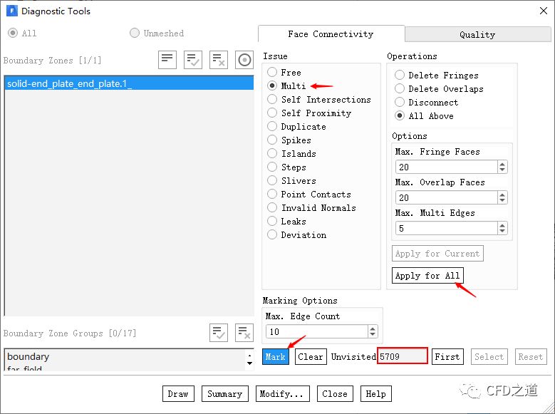 如下图所示操作检测面网格中的自由边,若存在自由边,可点击按钮Apply for All进行清理