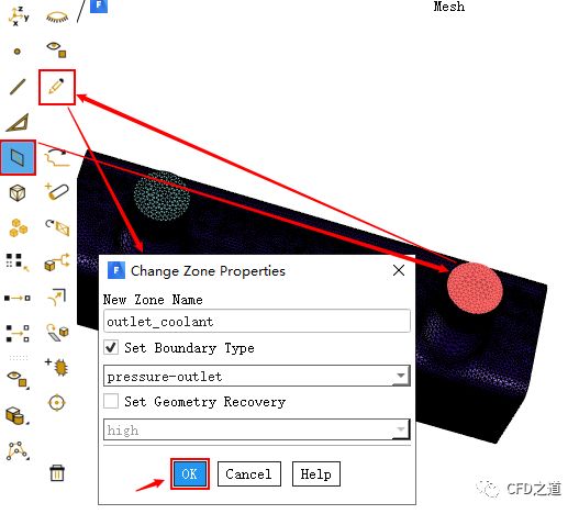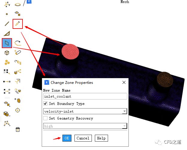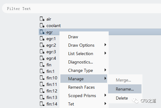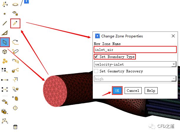 切换到zone选择模式,如下图所示利用鼠标右键选择空气入口面,点击工具栏按钮rename,如下图所示在弹出对话框中修改名称及边界类型