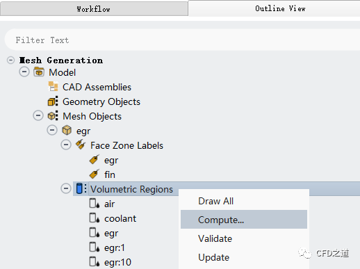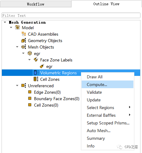 如下图所示,鼠标右键选择节点Volumetric Regions,点击弹出菜单项Compute…打开对话框