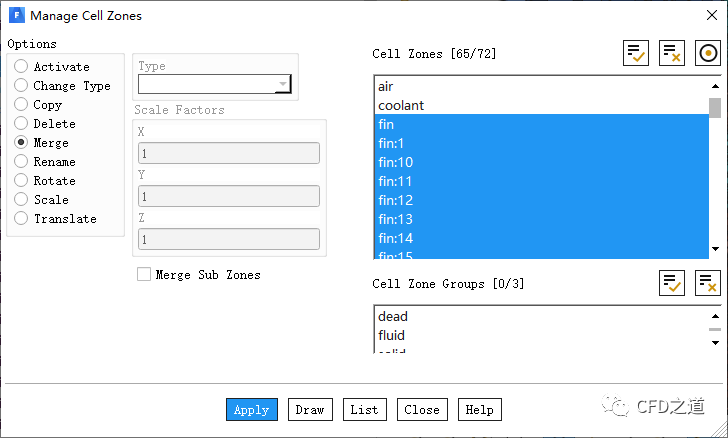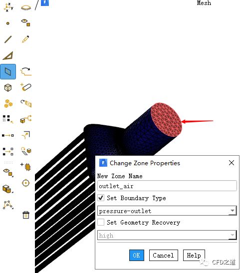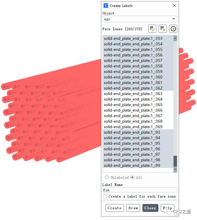 选择所有的导热管面,如下图所示设置其名称为fin,点击按钮Create并关闭对话框