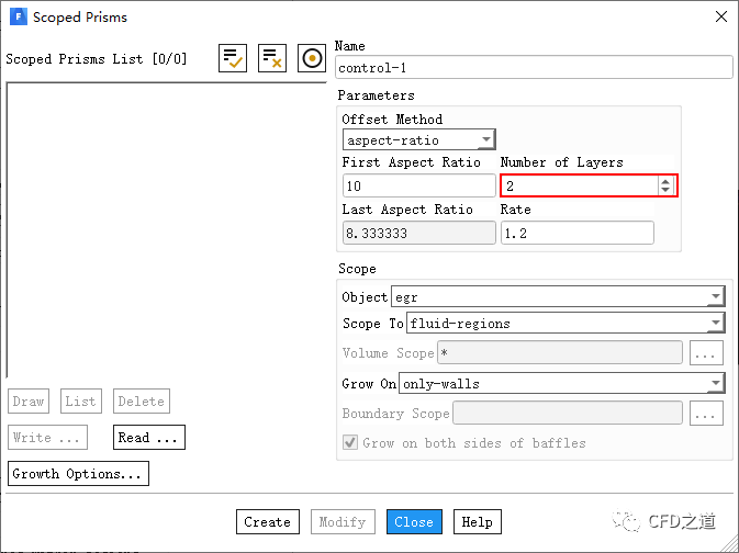 如下图所示设置Number of Layers为2,其他参数保持默认设置,点击按钮Create创建边界层信息,关闭对话框
