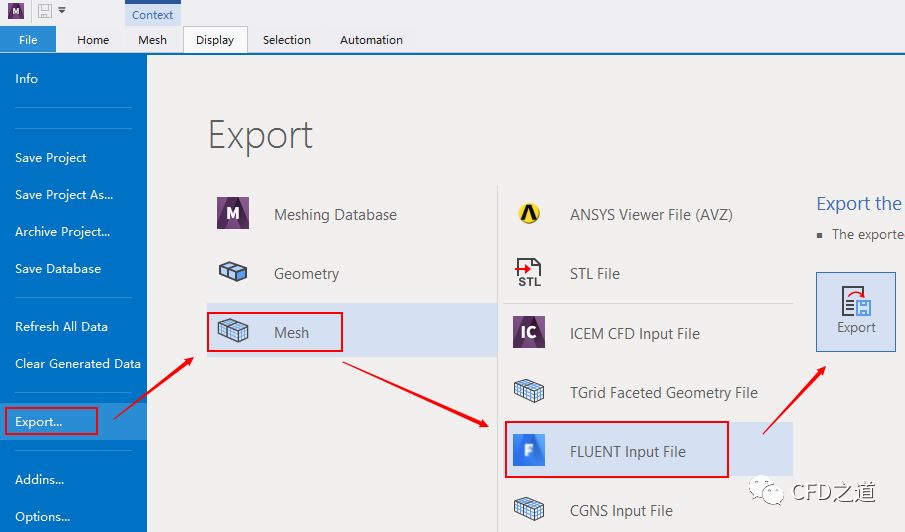 利用菜单File → Export… → Mesh → Fluent Input File → Export导出面网格demo7.msh