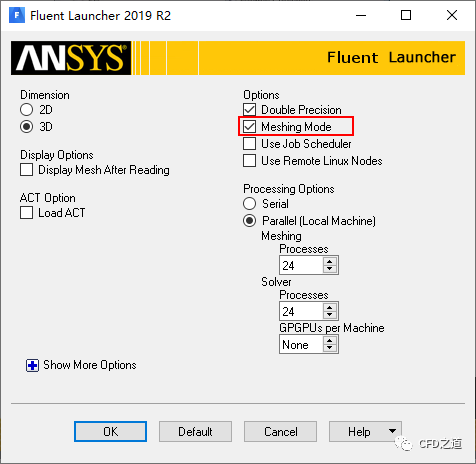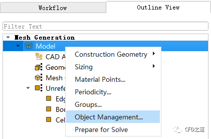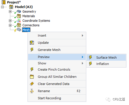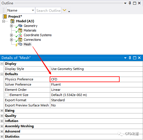 进入ANSYS Mesh模块,如下图所示设置Physics Preference为CFD