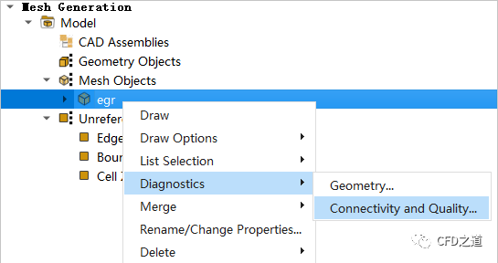 右键选择模型树节点egr,点击弹出菜单项Diagnostics → Connectivity and Quality…打开对话框