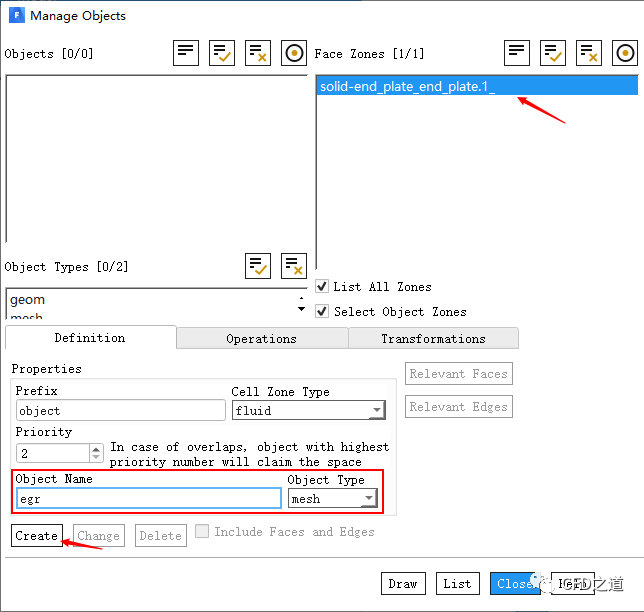 如下图所示操作,将面网格转化为mesh,并指定其名称为egr,点击Create按钮