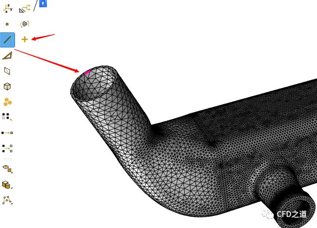 切换至edge选择模式,如下图所示,选中面网格中内壁边界上的一条edge,点击按钮Patch创建封闭面