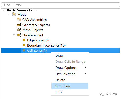 在Meshing模式中,鼠标右键选择节点Cell Zones,点击弹出菜单项Summary可查看网格信息
