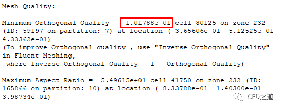 TUI窗口输出下图所示信息,从图中可查看网格最小正交质量约为0.101788,有必要改善网格质量
