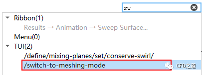 搜索窗框中输入sw可搜索出TUI命令switch-to-meshing-mode,点击该命令会自动将该命令输入到TUI中