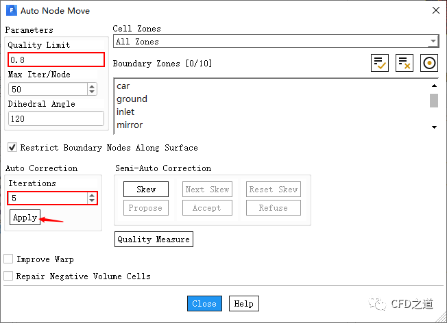 点击菜单项Mesh > Tools > Auto Node Move打开设置对话框,如下图所示,设置Quality Limit为0.8,设置Iterations为5,点击按钮Apply改良网格质量