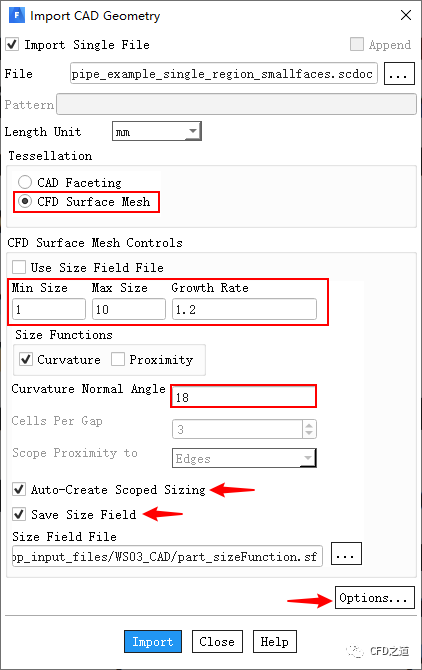 打开的的对话框中如下图所示设置:激活选项CFD Surface Mesh,设置最大最小网格尺寸,注意激活选项Save Size Field并设置文件名称,点击Option按钮打开对话框