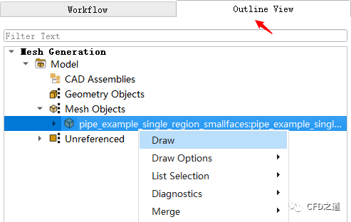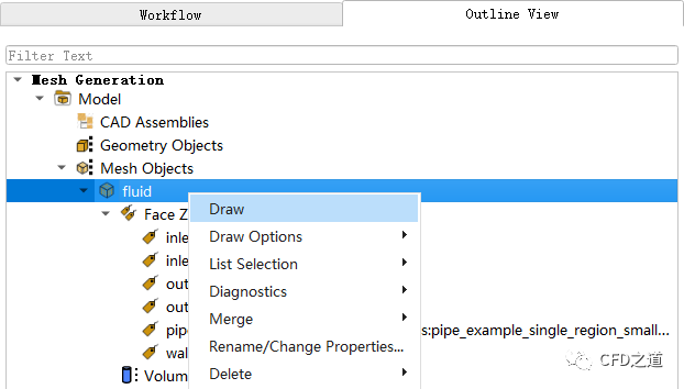 右键选择节点fluid,点击弹出菜单项Draw显示网格