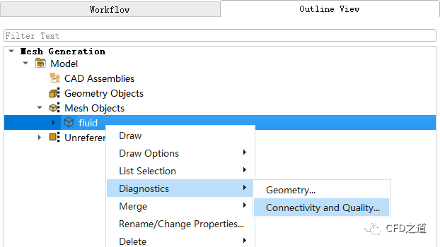 右键选择模型树节点fluid,点击菜单项Diagnostics > Connectivity and Quality打开对话框