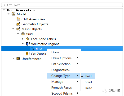如下图所示,右键选择节点fluid,点击菜单项Change Type → Fluid将区域类型修改为流体域