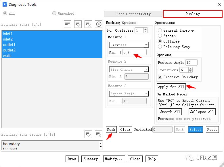 如下图所示对话框中,进入Quality标签页,设置歪斜率为0.7,设置Operations选项为Collapse,点击按钮Apply for All