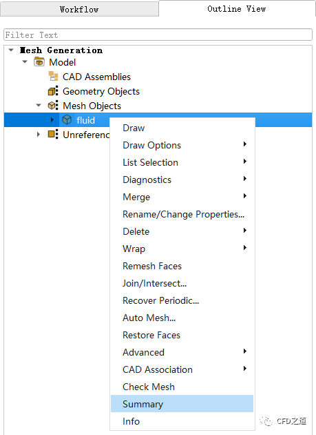 右键选择节点fluid,点击弹出菜单项Summary,将在TUI窗口输出网格信息