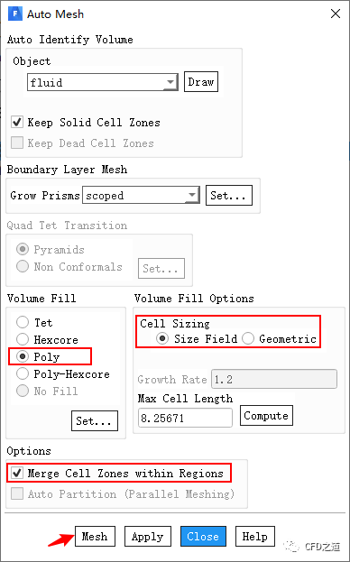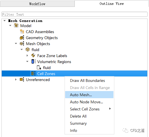 右键选择节点Cell Zones,点击菜单项Auto Mesh…打开对话框