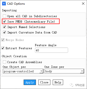 激活选项Save PMDB,点击Apply按钮关闭对话框,点击Import CAD Geometry对话框中的Import按钮导入几何模型