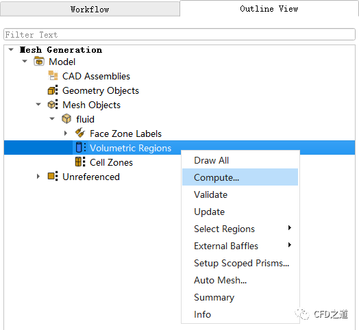 右键选择节点Volumetric Regions,点击菜单项Compute…生成计算域