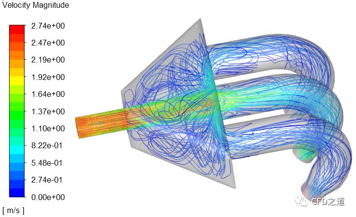指定入口速度2.5 m/s,指定中间出口表压2 Pa,其他两个出口表压0 Pa