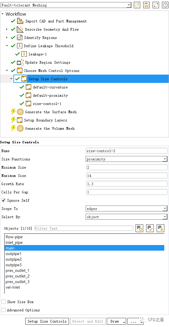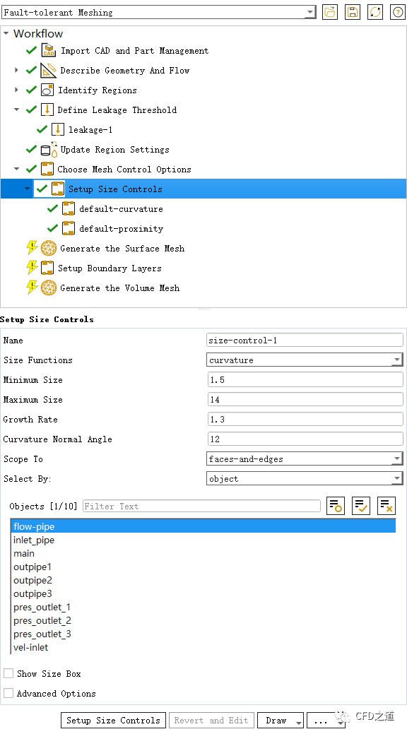 选择节点Setup Size Controls,如下图所示参数指定flow-pipe的参数控制