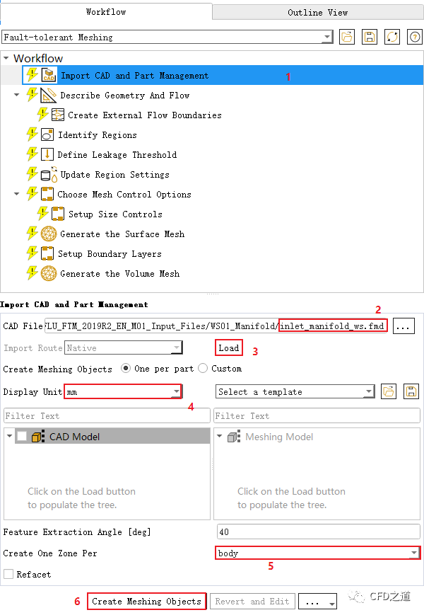 选择Import CAD and Part Management,如下图所示导入几何inlet_mainfold_ws.fmd