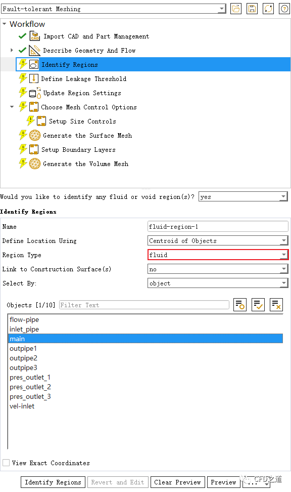 选择节点Identify Regions,以对象main创建fluid类型区域