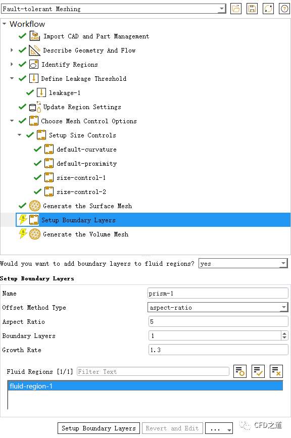 选择节点Setup Boundary Layers,如下图所示采用默认边界层参数