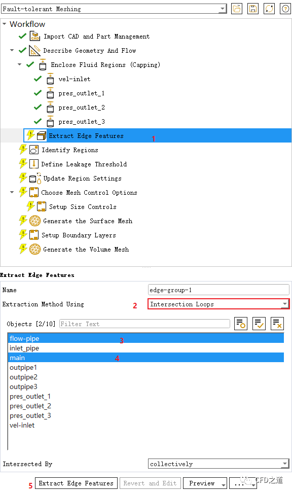 设置Extraction Method Using,选中列表选项flow-pipe及main