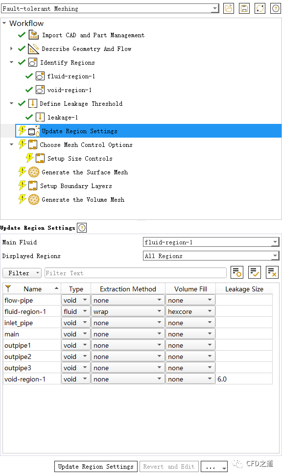 选择节点Update Region Settings,如下图所示,检查区域类型、抽取方法以及体网格生成方法