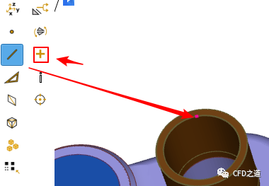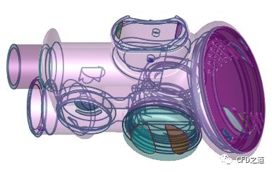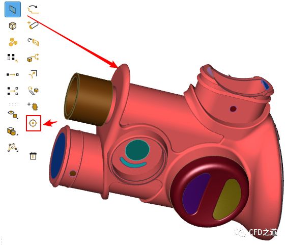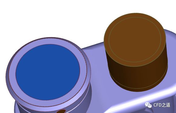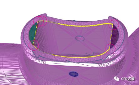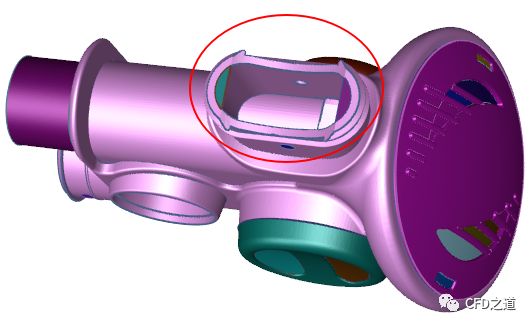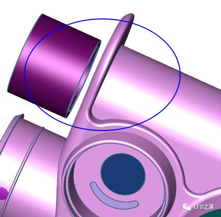 几何模型中存在孔洞,在创建流体计算域之前需要将孔洞堵上。如下图中框选位置的孔洞。