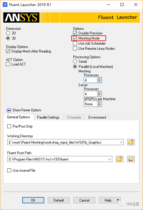 启动界面中激活选项Meshing Mode,并设置Working Directory