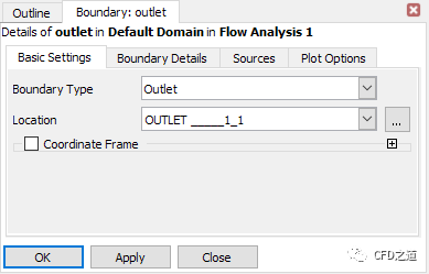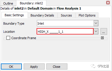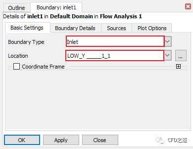 进入面板Basic Settings标签页,设置Boundary Type为Inlet,指定Location为LOW_Y___1_1,如下图所示